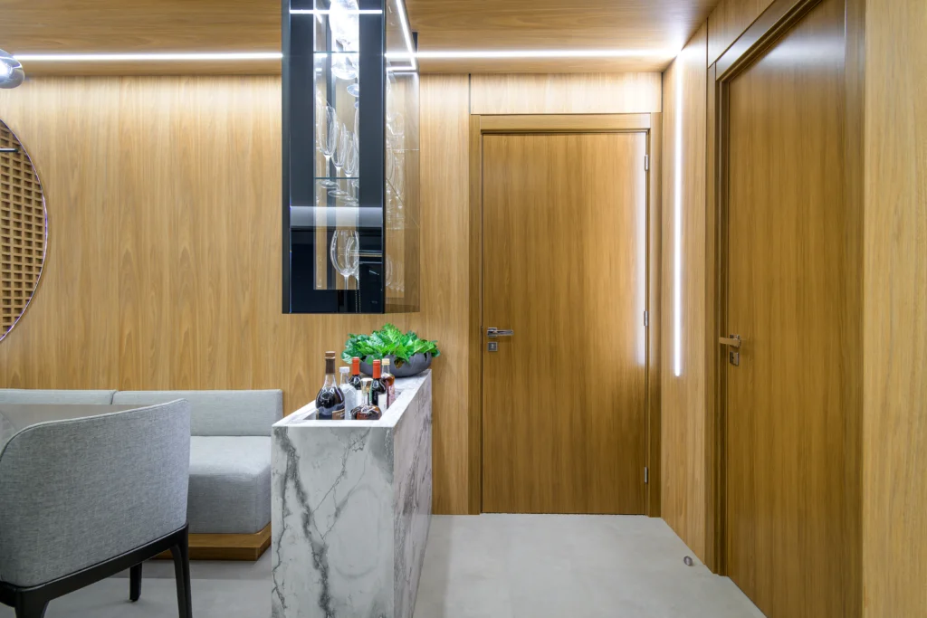 Porta com quadro em madeira e acabamento revestido em filme impermeável amadeirado.